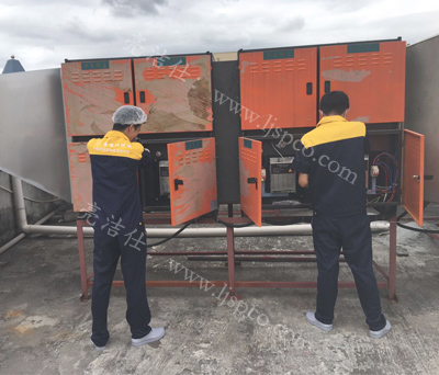 众所周知,长期使用的油烟机罩和抽风机、空气净化器、抽烟管道等如果不经常清洗,会有很多油渍残留在烟机上和烟道表面,时间久了会形成油垢,这些油垢使用简单的清洗方法是处理不掉的,这样会影响油烟机和烟道的使用,使烟流不易排除。本公司采用高压射流和强力化油剂,对烟道进行除油污处理后,再做保养。可使油烟气流明显好转,还可以在表面形成一层保护膜使油渍不易残留在风管表面。我们使用人工铲除油垢配合超强金属专用清洁剂,对油烟机表面油污清除效果显著,无毒、无味、不伤金属和瓷面。我司现已完成上百个大型油烟机的清洗工作。